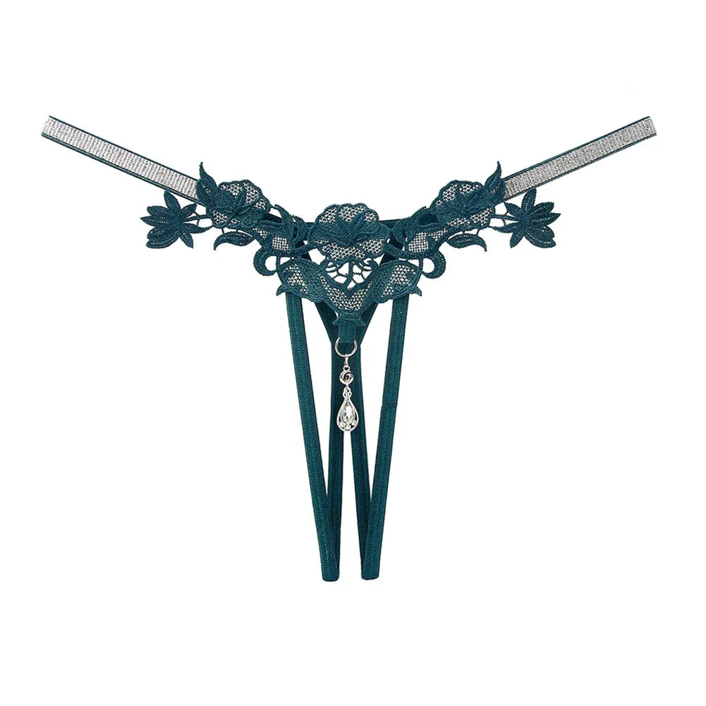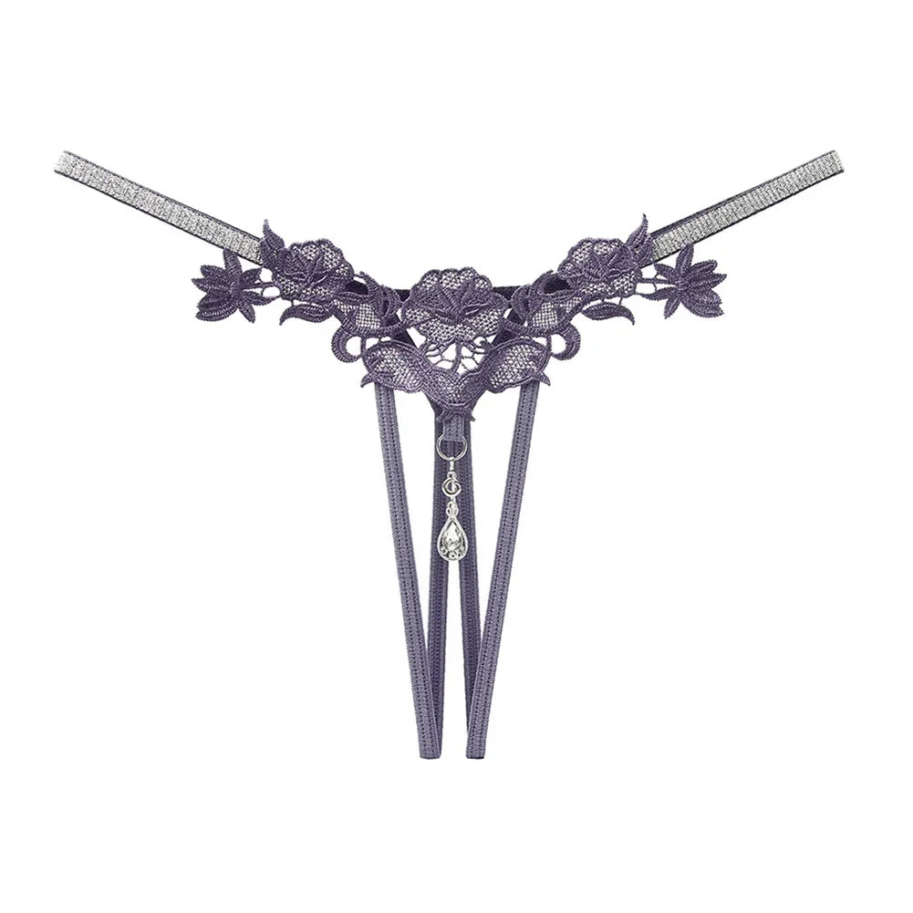 Detalhes: Tanga com laço nas costas, design transparente e adornos com pérolas e strass
